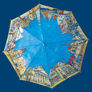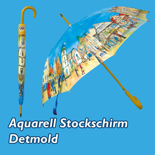 Aquarell-Schirme: Stockschirme mit Automatikfunktion, solidem Gestänge und Fiberglasrippen. Die Schirme sind mit vierfarbig bedrucktem Polyester bespannt und haben eine ebenfalls vierfarbige Hülle.